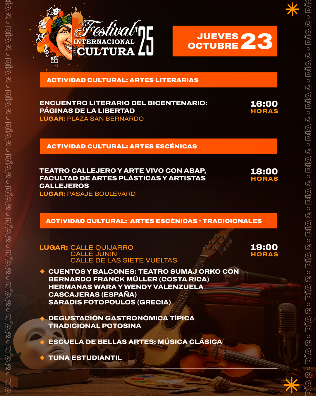El Festival Internacional de la Cultura (FIC) del GAM Potosí continúa su programación hoy, jueves 23 de octubre, con una jornada dedicada a las artes literarias y escénicas. Tras un vibrante inicio, el Día 2 se centra en espacios al aire libre, invitando a la ciudadanía a unirse a la celebración cultural.
