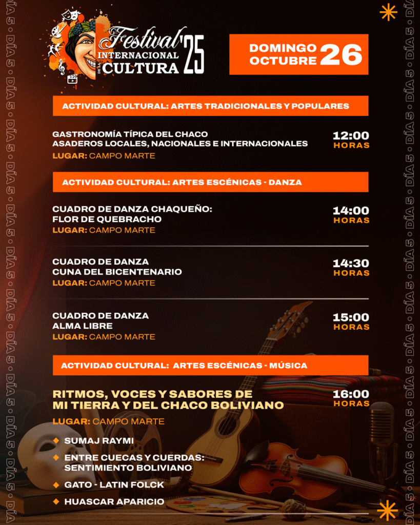El broche de oro musical iniciará a las 16:00 horas con el evento “Ritmos, Voces y Sabores de mi Tierra y del Chaco Boliviano”. Este contará con las actuaciones de Sumaj Raymi, Entre Cuecas y Cuerdas: Sentimiento Boliviano, Gato – Latin Folck y el esperado show de Huascar Aparicio Jr.